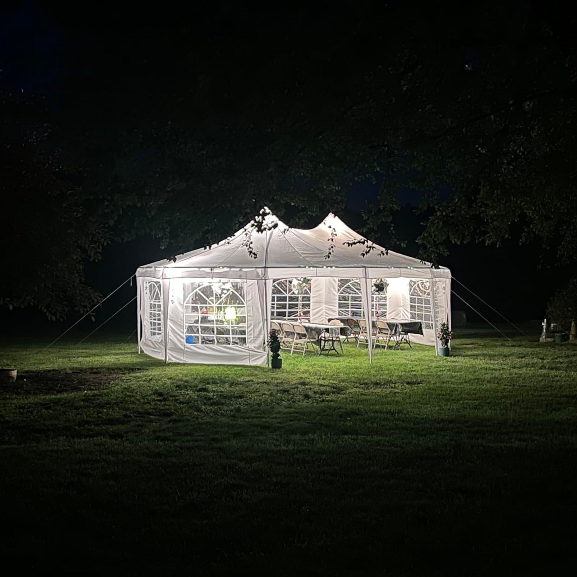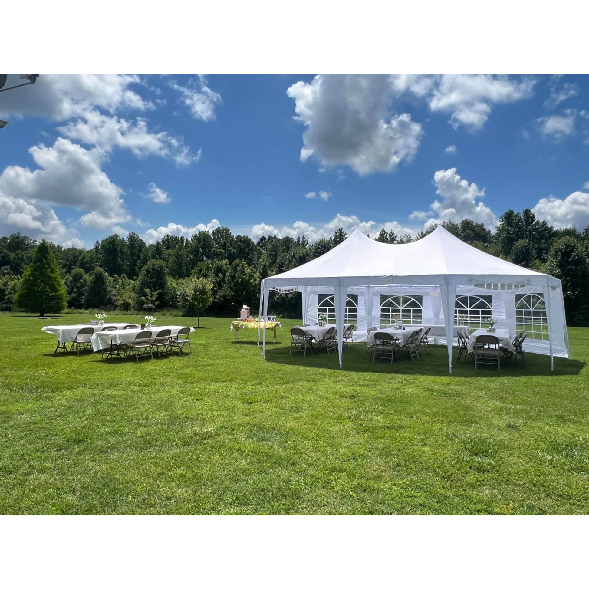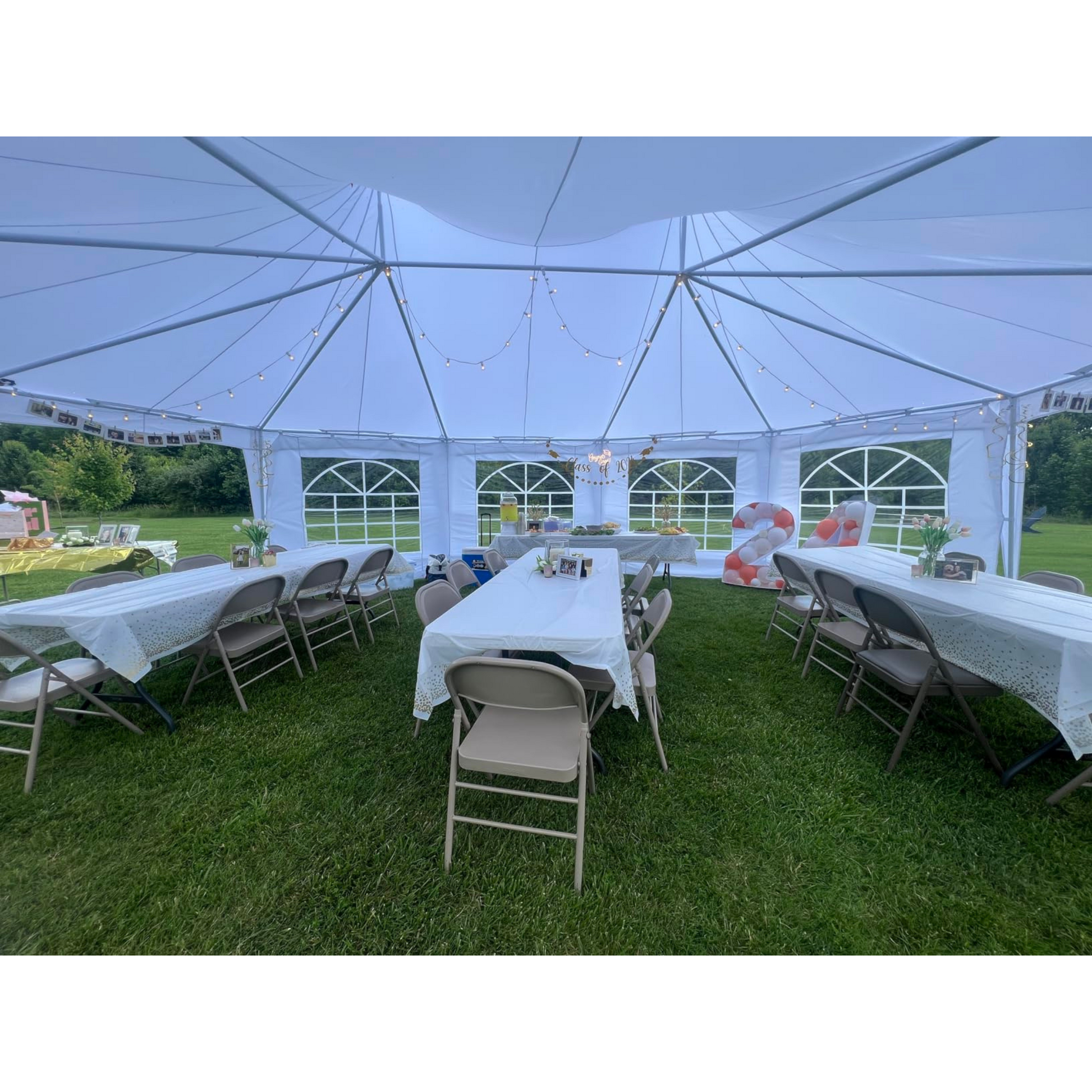 This 29'x23' canopy tent is super versatile and perfect for weddings, parties, or any outdoor event that needs a little extra style and coverage. It features 10 beautiful church-style windows that let in tons of natural light and 2 pull-back doors for easy access and a nice open flow. You can fully enclose it, leave parts open, or take down some or all of the walls—it’s totally up to you and the vibe you’re going for. Whether you want an open-air feel, some shade with a breeze, or a cozy enclosed space, this tent can do it all. It is made with waterproof, UV-protected, and weather-resistant materials. Clean, classic, and easy to work with, it’s a great pick for both casual get-togethers and more formal setups.