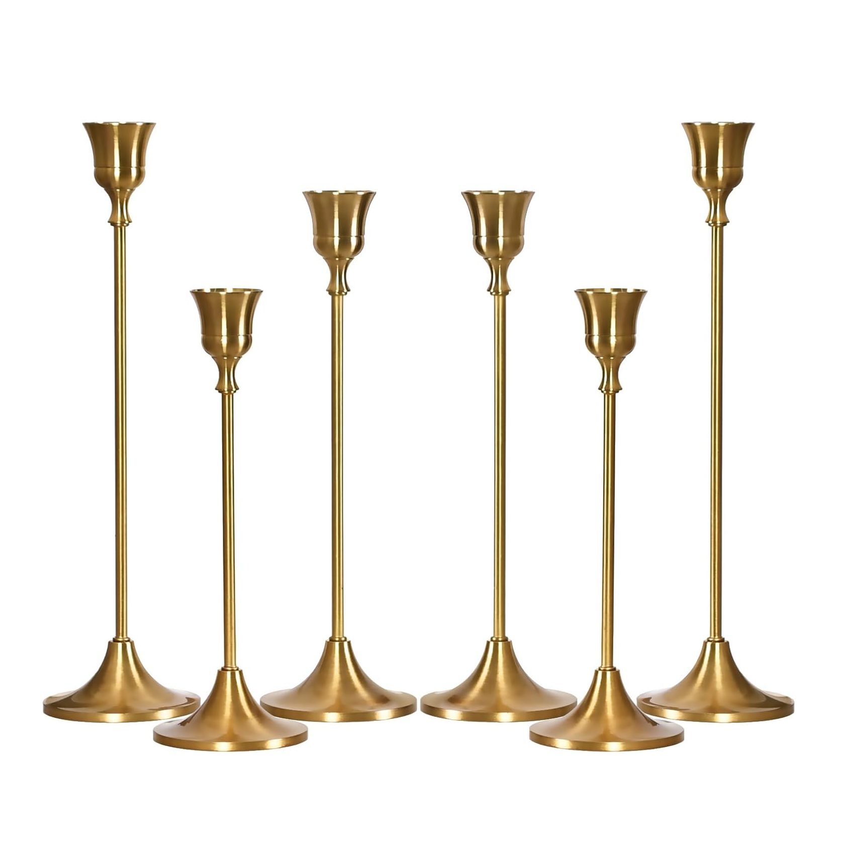 Set of 6 beautiful brass gold candlestick holders. They will add a vintage touch to your event. This set includes two 7.67", two 8.86", and two 10" tall holders for a dynamic display! Comes with a non-slip base for stability. Fits a standard candle.
