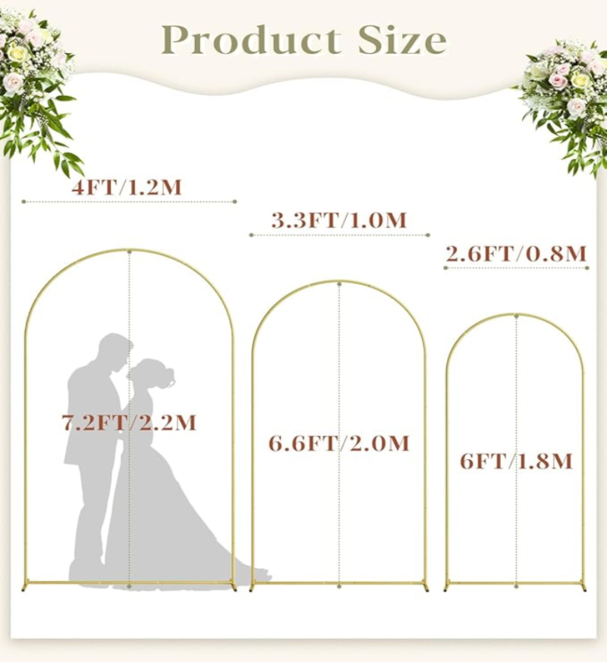 Transform your wedding decor with our Gold Wedding Arch Stand, featuring a set of 3 metal arches and a stunning gold finish. This versatile set can be used as a backdrop for photos or to create a beautiful floral or balloon arch for your ceremony. It's the perfect addition to any ceremony decoration.