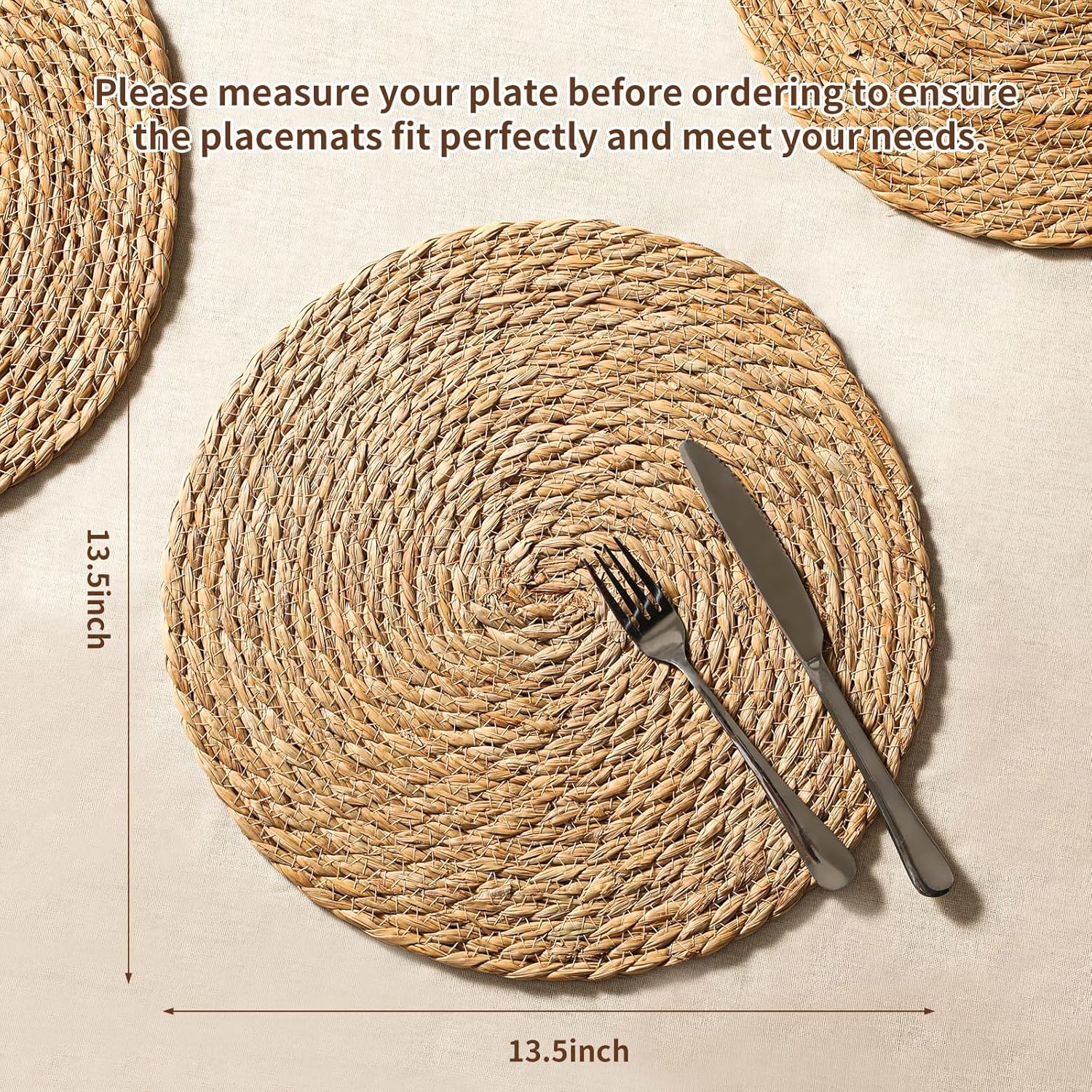 Bring natural texture and effortless style to any table with our boho-inspired woven rattan chargers. 13.5-inch round placemat doubles as a rustic charger, creating a warm, organic backdrop for dinner plates.