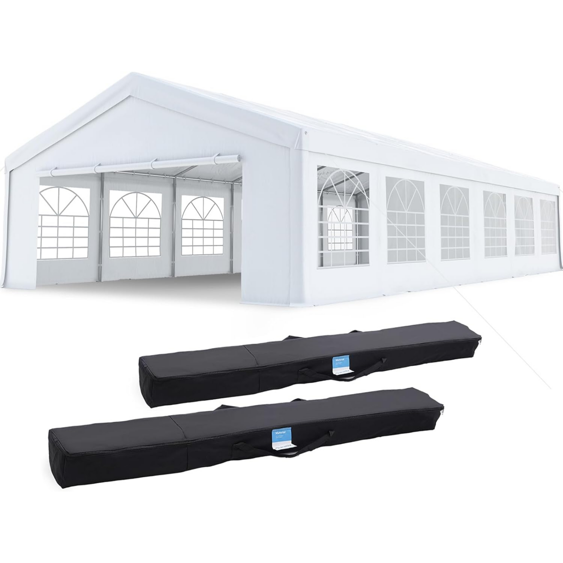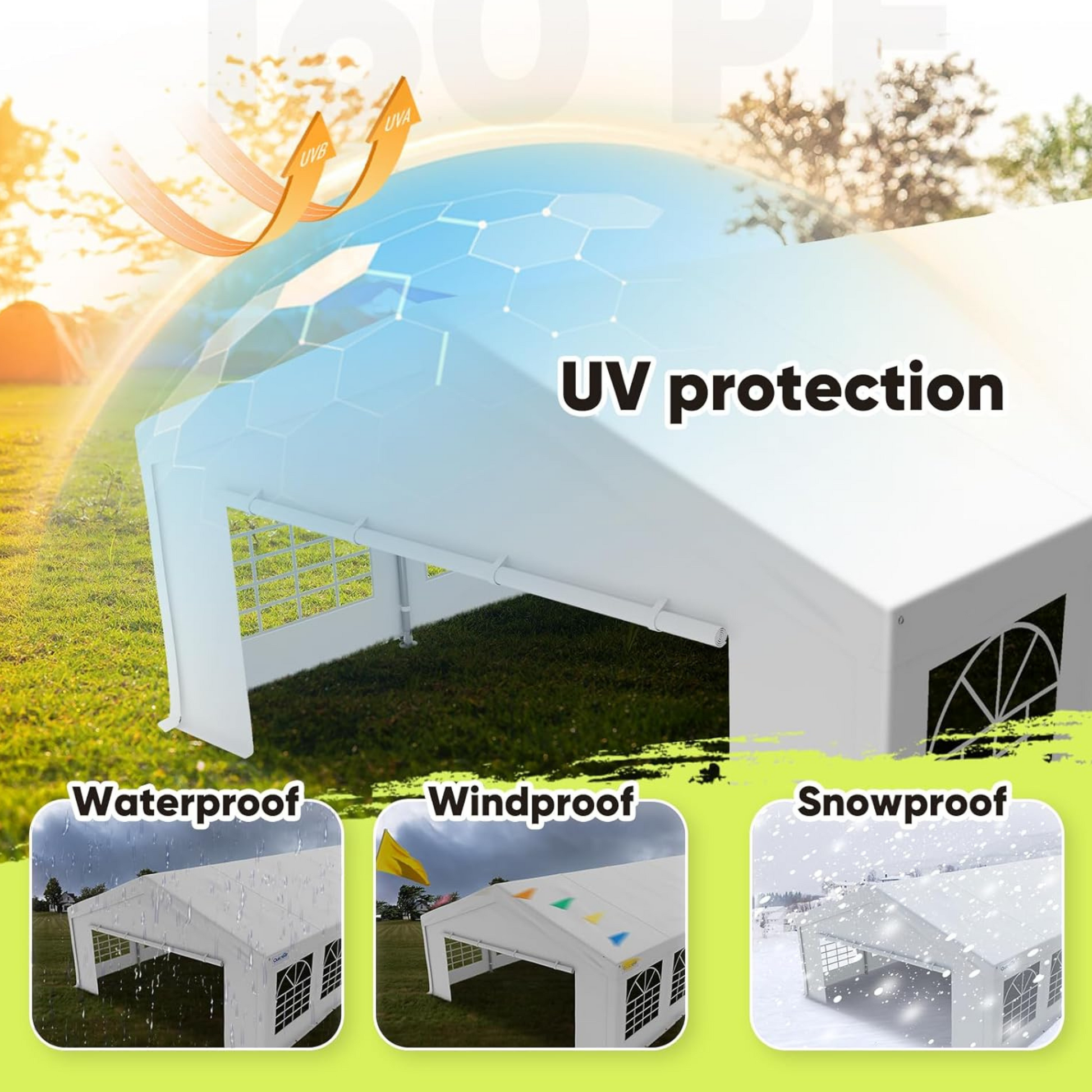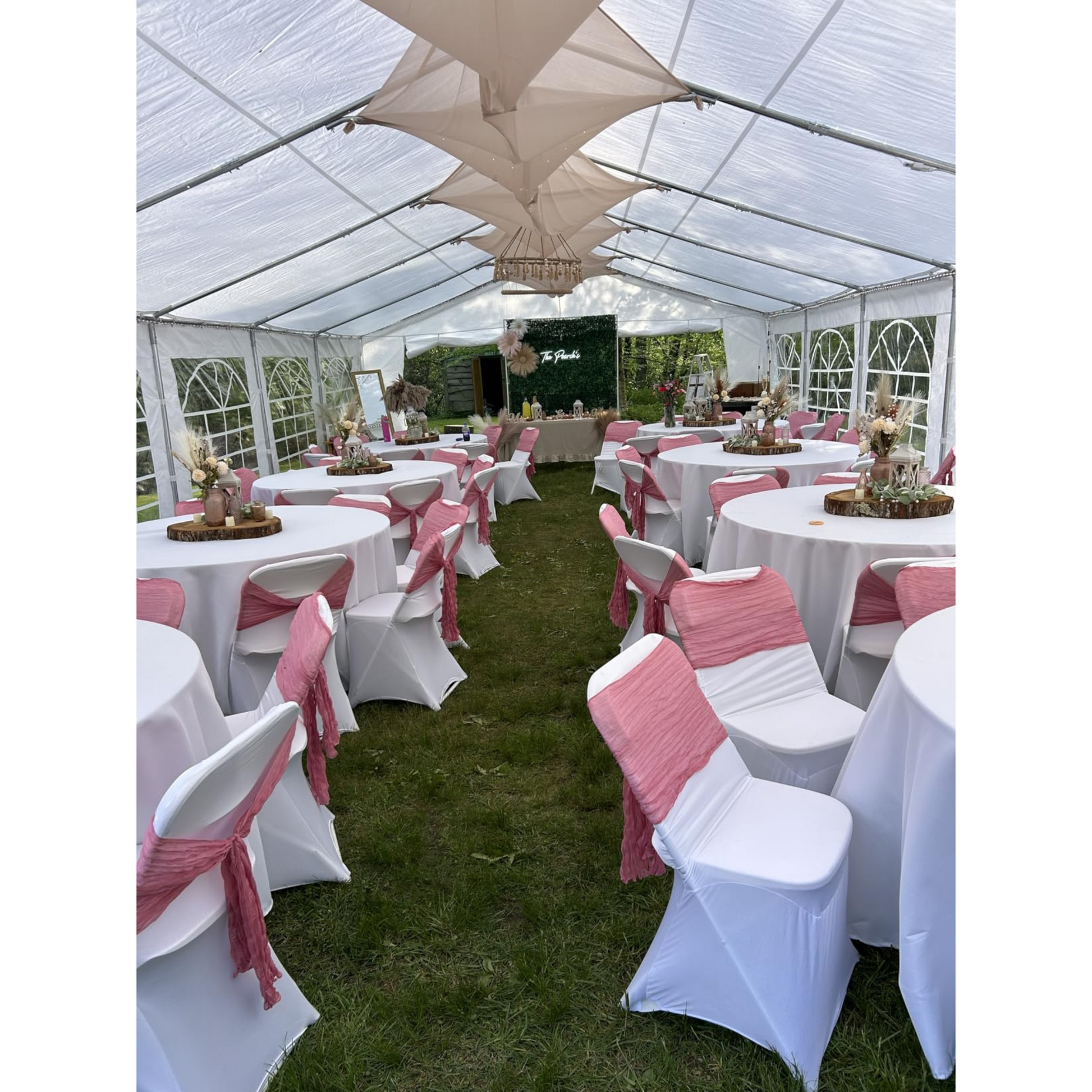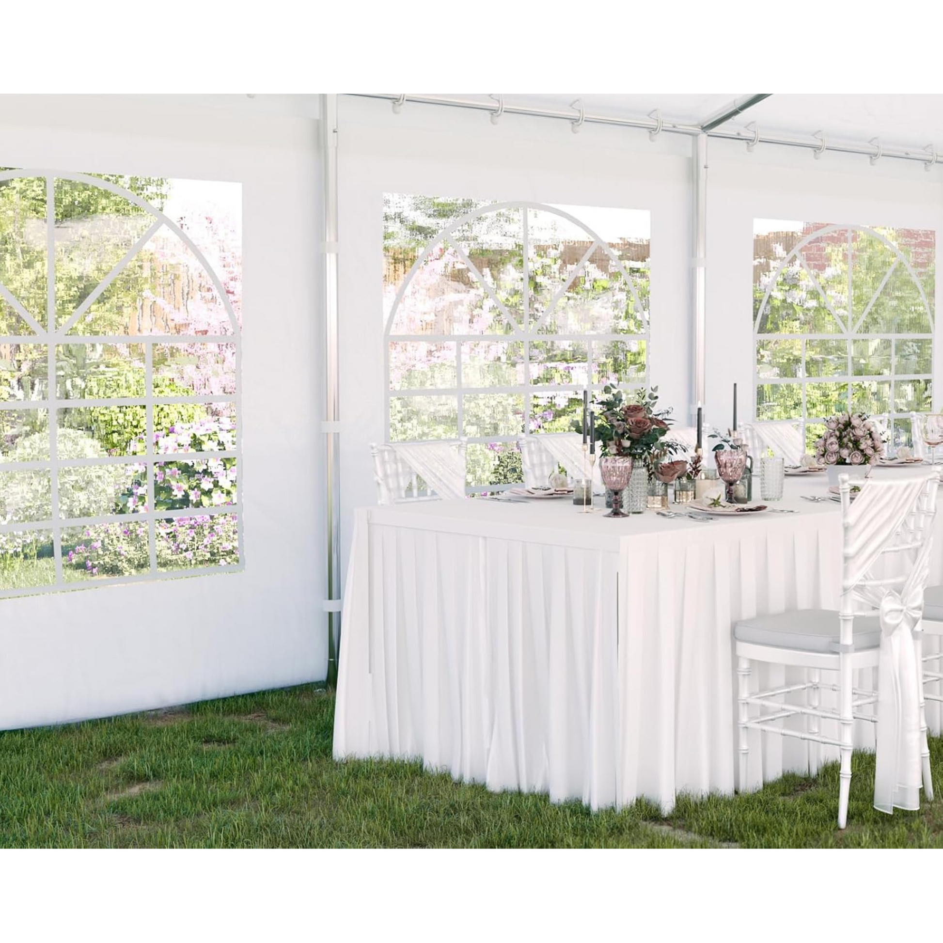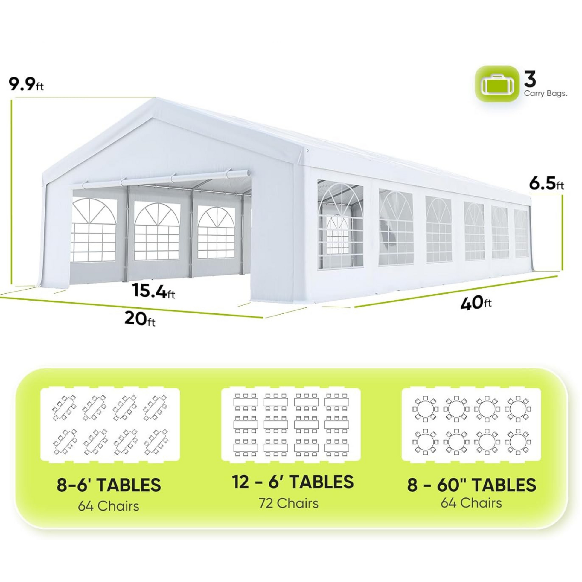 This 20'x40' white tent is perfect for outdoor weddings, receptions, parties, or any event where you want to keep it classy and covered. It’s fully waterproof, snow-resistant, and has built-in UV protection—so whether it’s sunny, rainy, or even a little chilly, you’re good to go. It comfortably fits around 64–72 people seated at tables, or 100+ if everyone’s standing and mingling. The clean white look gives it that timeless, elegant vibe while still keeping things simple and easy. It is also adjustable and comes with removable side walls/windows! Whether you're planning a backyard wedding or a big celebration, this tent has you covered—literally.