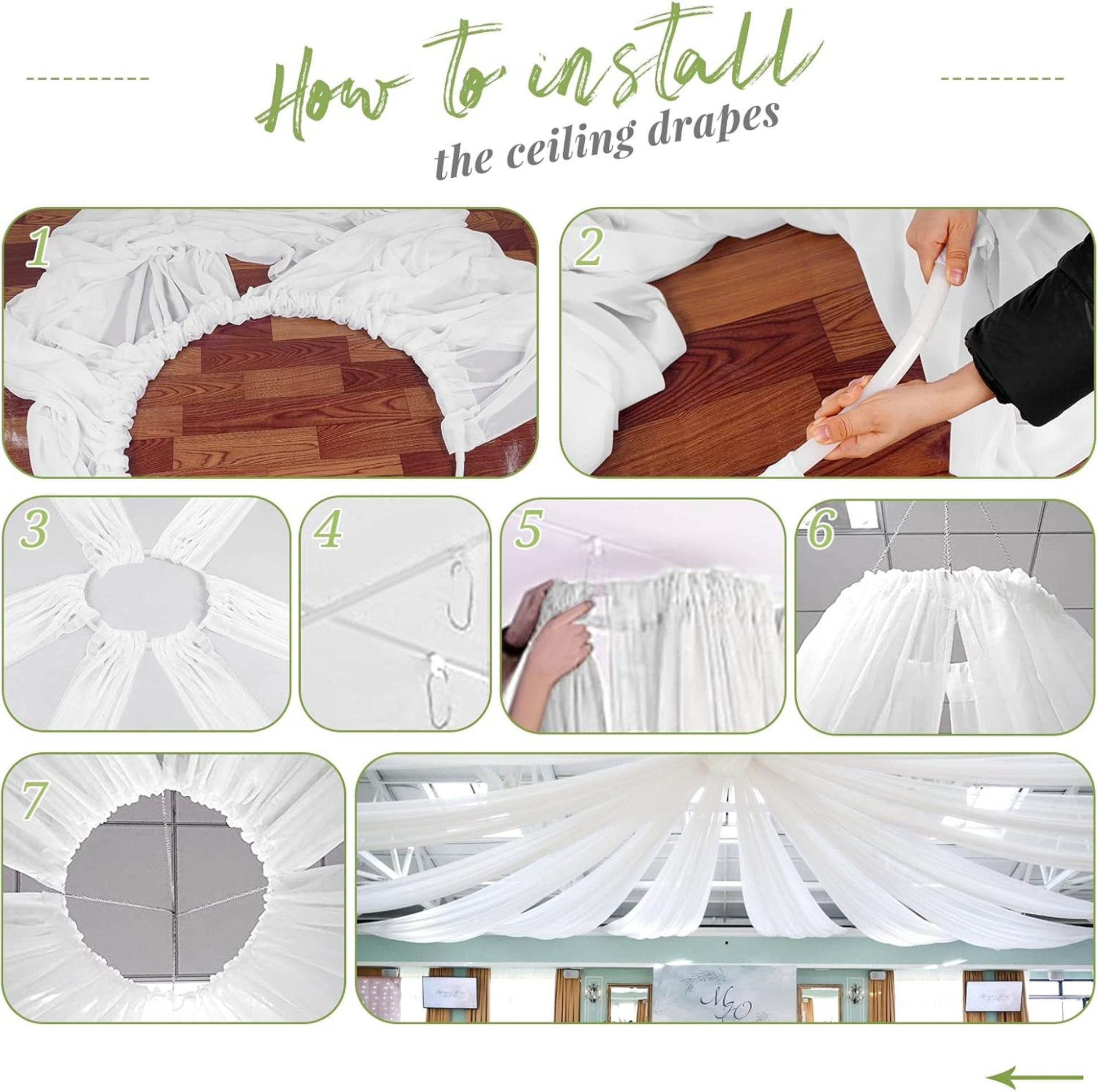 Transform your venue with this elegant set of six sheer white ceiling drapes, each measuring 5 feet wide by 20 feet long. Crafted from soft voile chiffon, these flowing panels add a romantic, airy touch to any event space—perfect for wedding ceilings, arches, photo backdrops, and ceremony stages.